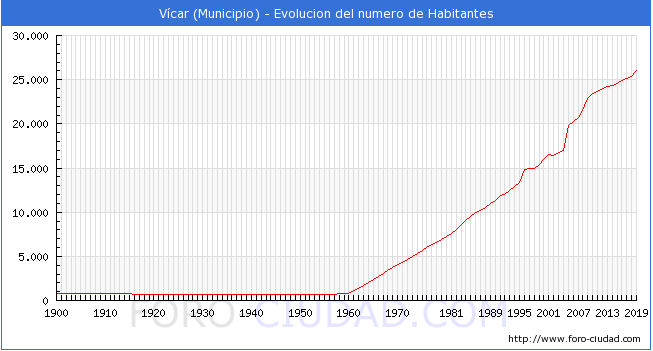 Según los datos publicados por el INE a 1 de Enero de 2019 el numero de habitantes en Vícar es de 26.028, 623 habitantes mas que el en el año 2018. En el gráfico siguiente se puede ver cuantos habitantes tiene Vícar a lo largo de los años.